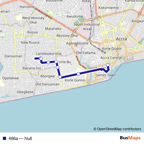 The first stop of the 486a bus route is Soko and the last stop is Terminal Accra Post Office. 486a (Null) is operational during everyday.