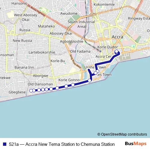 The first stop of the 521a bus route is Terminal Accra New Tema Station and the last stop is Terminal Chemuna Station. 521a (Accra New Tema Station to Chemuna Station) is operational during everyday.