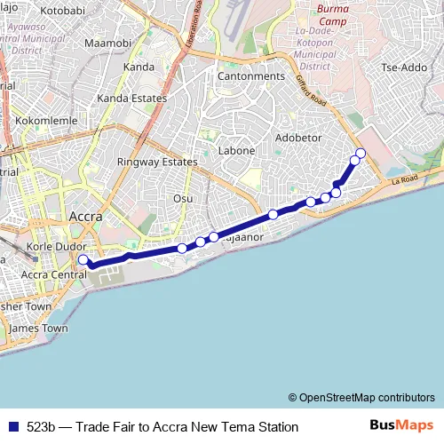 The first stop of the 523b bus route is Terminal Trade Fair and the last stop is Terminal Accra New Tema Station. 523b (Trade Fair to Accra New Tema Station) is operational during everyday.