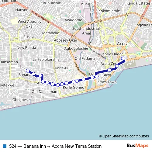 The first stop of the 524 bus route is Accra New Tema Station and the last stop is Banana Inn. 524 (Banana Inn ↔ Accra New Tema Station) is operational during everyday.