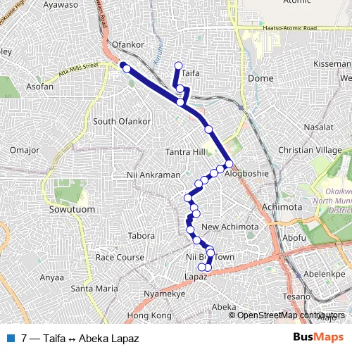 The first stop of the 7 bus route is Taifa and the last stop is Abeka Lapaz. 7 (Taifa ↔ Abeka Lapaz) is operational during everyday.