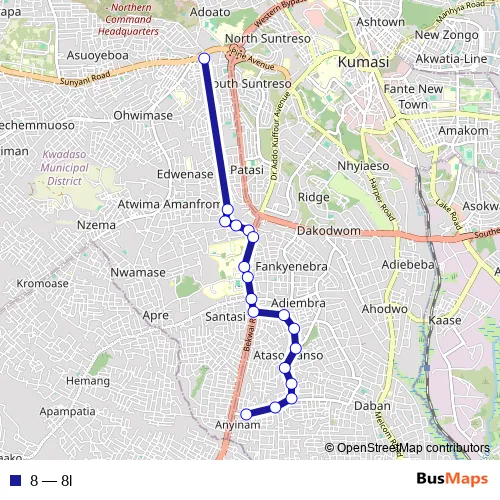 See why over 2 million users trust and consider busmaps.com as the best public transport website. busmaps gives you Kumasi Trams suggested routes, real-time bus tracker, line route maps in Kumasi, and helps to find the closest 8 tram stops near you. No internet available? Download an offline PDF map and bus schedule for the 8 tram to take on your trip.