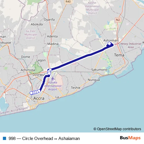 Click here to view the nearest 998 - Circle Overhead ↔ Ashaiaman bus stop.