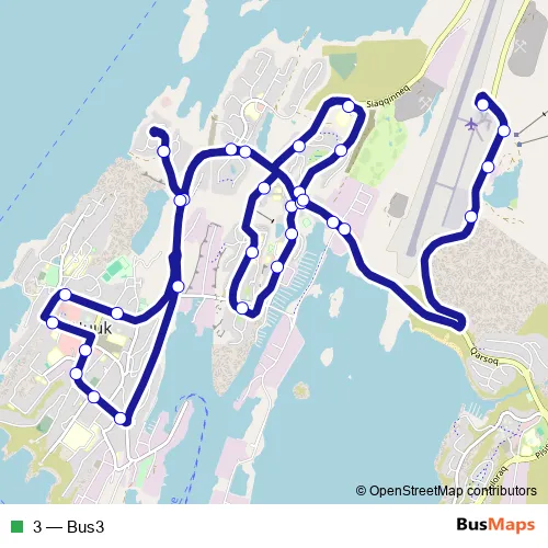 The first stop of the 3 bus route is H.J.Rinksvej and the last stop is Eqalugalinnguittasiat. 3 (Bus3) is operational during everyday.