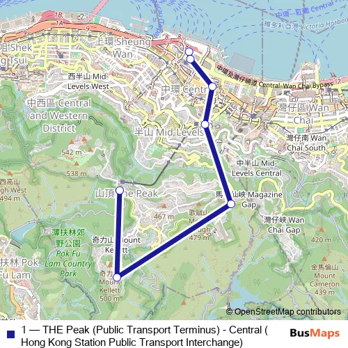 The first stop of the 1 bus route is Hong Kong Station Minibus Terminus and the last stop is THE Peak Galleria (BUS Terminus Under). 1 (THE Peak (Public Transport Terminus) - Central (Hong Kong Station Public Transport Interchange)) is operational during everyday.
