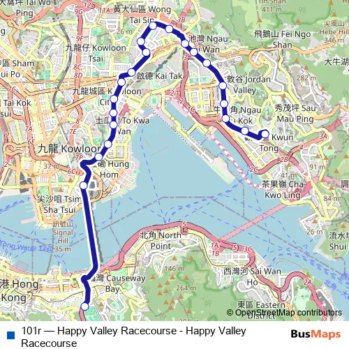 The first stop of the 101r bus route is Morrison Hill Road, outside Happy Valley Racecourse and the last stop is Kwun Tong (Yue Man Square). 101r (Happy Valley Racecourse - Happy Valley Racecourse) is operational during everyday.