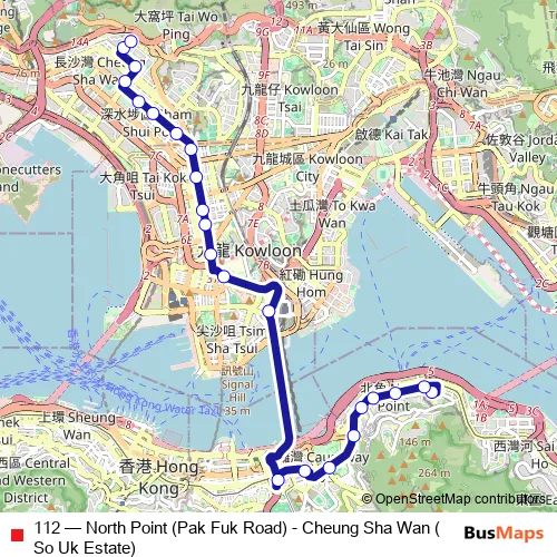 The first stop of the 112 bus route is North Point (Pak Fuk Road) Bus Terminus and the last stop is Cheung Sha Wan (So Uk Estate) Bus Terminus. 112 (North Point (Pak Fuk Road) - Cheung Sha Wan (So Uk Estate)) is operational during everyday.