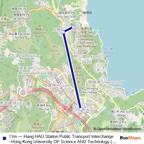 The first stop of the 11m bus route is Hang HAU Station Public Transport Interchange and the last stop is Hong Kong University OF Science AND Technology (North Station)|Hong Kong University OF Science AND Technology. 11m (Hang HAU Station Public Transport Interchange - Hong Kong University OF Science AND Technology (North Station)) is operational during everyday.