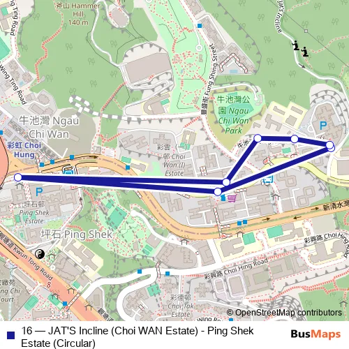 The first stop of the 16 bus route is Ngau CHI WAN Street Opposite Fung Chak House, Choi WAN Estate and the last stop is Ngau CHI WAN Street Opposite Fung Chak House, Choi WAN Estate. 16 (JAT'S Incline (Choi WAN Estate) - Ping Shek Estate (Circular)) is operational during everyday.