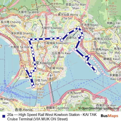 The first stop of the 20a bus route is [Ctb] HSR West Kowloon Station|[Kmb] Jordan (West Kowloon Station) BUS Terminus and the last stop is [Ctb] KAI TAK Cruise Terminal|[Kmb] KAI TAK Cruise Terminal. 20a (High Speed Rail West Kowloon Station - KAI TAK Cruise Terminal (VIA MUK ON Street)) is operational during everyday.