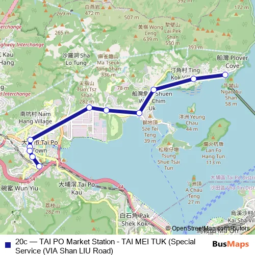 The first stop of the 20c bus route is TAI MEI TUK Public Transport Interchange and the last stop is TAI PO Market Station Minibus Terminus. 20c (TAI PO Market Station - TAI MEI TUK (Special Service (VIA Shan LIU Road)) is operational during everyday.