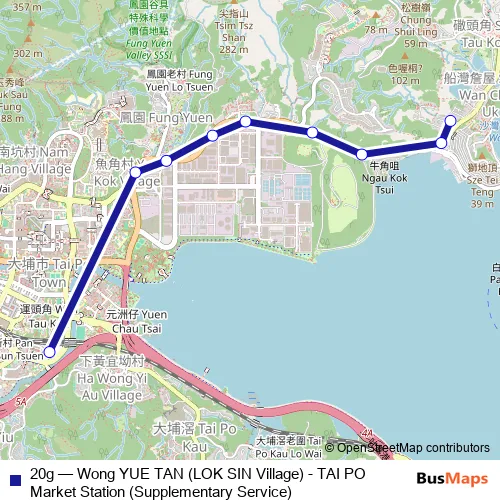 The first stop of the 20g bus route is Wong YUE TAN (LOK SIN Village) and the last stop is TAI PO Market Station Minibus Terminus. 20g (Wong YUE TAN (LOK SIN Village) - TAI PO Market Station (Supplementary Service)) is operational during everyday.