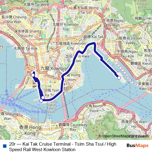 The first stop of the 20r bus route is Kai Tak Cruise Terminal and the last stop is Tsim Sha Tsui (Star Ferry). 20r (Kai Tak Cruise Terminal - Tsim Sha Tsui / High Speed Rail West Kowloon Station) is operational during everyday.