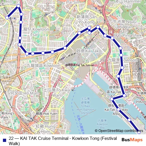 Click here to view the nearest 22 - KAI TAK Cruise Terminal - Kowloon Tong (Festival Walk) bus stop.