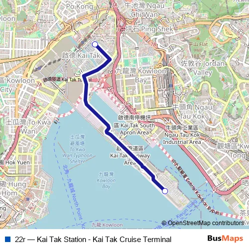 The first stop of the 22r bus route is Kai Tak Cruise Terminal and the last stop is Kai Tak - MTR Exit A, Muk On Street. 22r (Kai Tak Station - Kai Tak Cruise Terminal) is operational during everyday.