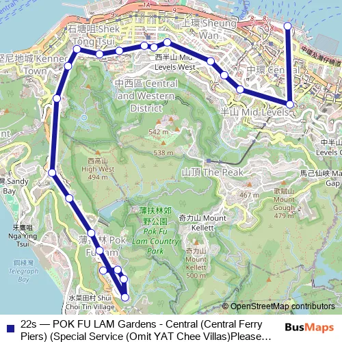 Services on the 22s - POK FU LAM Gardens - Central (Central Ferry Piers) (Special Service (Omit YAT Chee Villas)Please Inquire With THE Operator About THE Payment Arrangement OF THE TWO-WAY Fare ON This Route.) bus stop at 20:28 on Monday, Tuesday, Wednesday, Thursday, Friday, Saturday, Sunday.