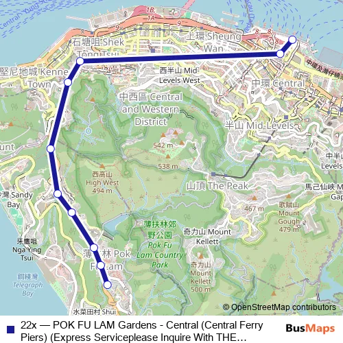 The first stop of the 22x bus route is Claymore Avenue, POK FU LAM Garden|Chi FU Road, Outside Block NO. 14 and the last stop is Central (Central Ferry Piers)|Central Ferry Piers|Central Ferry Piers. 22x (POK FU LAM Gardens - Central (Central Ferry Piers) (Express Serviceplease Inquire With THE Operator About THE Payment Arrangement OF THE TWO-WAY Fare ON This Route.)) is operational during everyday.