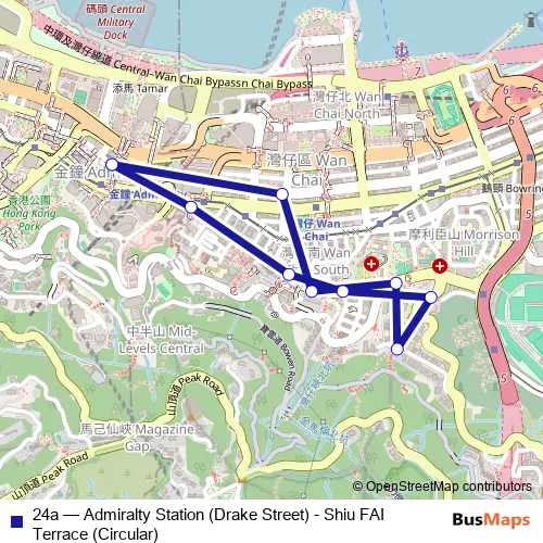 The first stop of the 24a bus route is Drake Street, Near MTR Exit and the last stop is Drake Street, Near MTR Exit. 24a (Admiralty Station (Drake Street) - Shiu FAI Terrace (Circular)) is operational during everyday.