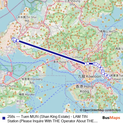 See why over 2 million users trust and consider busmaps.com as the best public transport website. busmaps gives you Tuen Mun Buses suggested routes, real-time bus tracker, line route maps in Tuen Mun, and helps to find the closest 258s bus stops near you. No internet available? Download an offline PDF map and bus schedule for the 258s bus to take on your trip.