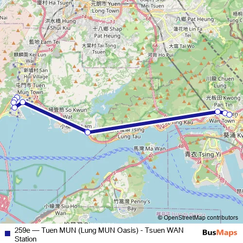 See why over 2 million users trust and consider busmaps.com as the best public transport website. busmaps gives you Tuen Mun Buses suggested routes, real-time bus tracker, line route maps in Tuen Mun, and helps to find the closest 259e bus stops near you. No internet available? Download an offline PDF map and bus schedule for the 259e bus to take on your trip.