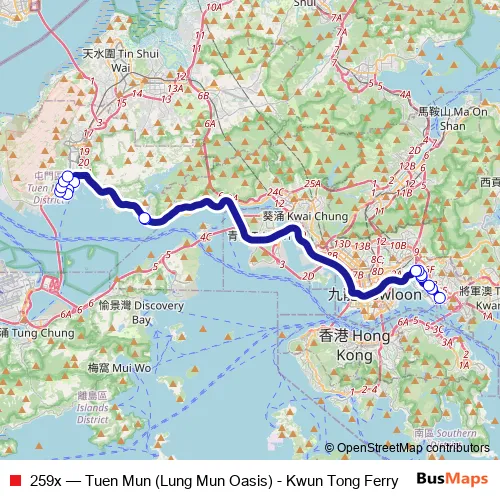 See why over 2 million users trust and consider busmaps.com as the best public transport website. busmaps gives you Tuen Mun Buses suggested routes, real-time bus tracker, line route maps in Tuen Mun, and helps to find the closest 259x bus stops near you. No internet available? Download an offline PDF map and bus schedule for the 259x bus to take on your trip.