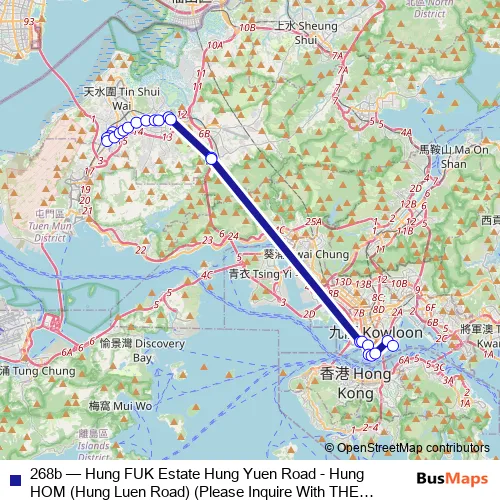 See why over 2 million users trust and consider busmaps.com as the best public transport website. busmaps gives you Yuen Long Buses suggested routes, real-time bus tracker, line route maps in Yuen Long, and helps to find the closest 268b bus stops near you. No internet available? Download an offline PDF map and bus schedule for the 268b bus to take on your trip.