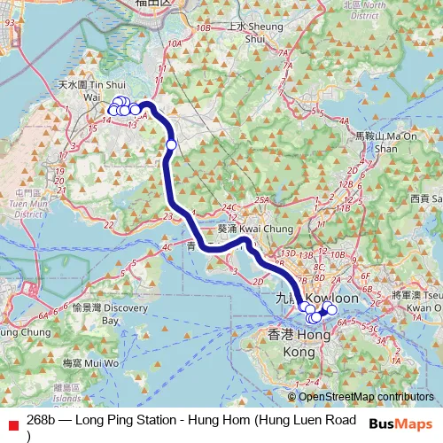 The first stop of the 268b bus route is Long Ping Station Bus Terminus and the last stop is Hung Hom (Hung Luen Road), Kerry Hotel. 268b (Long Ping Station - Hung Hom (Hung Luen Road)) is operational during everyday.