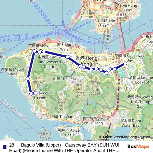 The first stop of the 28 bus route is SUN WUI Road, Near Capital Building and the last stop is Baguio Villa (Upper) Minibus Terminus. 28 (Baguio Villa (Upper) - Causeway BAY (SUN WUI Road) (Please Inquire With THE Operator About THE Payment Arrangement OF THE TWO-WAY Fare ON This Route.)) is operational during everyday.