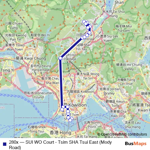 Tsim SHA Tsui (Mody Road)|[Kmb] Tsim SHA Tsui East (Mody Road) and the last stop is [Kmb] SUI WO Court BUS Terminus. 280x (SUI WO Court - Tsim SHA Tsui East (Mody Road)) is operational during everyday.