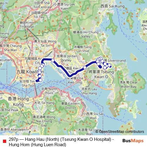 The first stop of the 297p bus route is Hang Hau (Tseung Kwan O Hospital) and the last stop is Hung Hom (Hung Luen Road), Kerry Hotel. 297p (Hang Hau (North) (Tseung Kwan O Hospital) - Hung Hom (Hung Luen Road)) is operational during on weekdays.