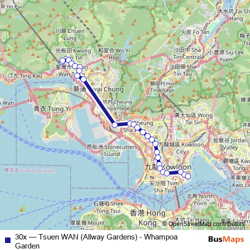 See why over 2 million users trust and consider busmaps.com as the best public transport website. busmaps gives you Tsuen Wan Buses suggested routes, real-time bus tracker, line route maps in Tsuen Wan, and helps to find the closest 30x bus stops near you. No internet available? Download an offline PDF map and bus schedule for the 30x bus to take on your trip.