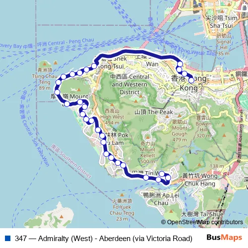 The first stop of the 347 bus route is Aberdeen Main Road, outside St Peter's Secondary School and the last stop is Admiralty - MTR Exit B. 347 (Admiralty (West) - Aberdeen (via Victoria Road)) is operational during everyday.