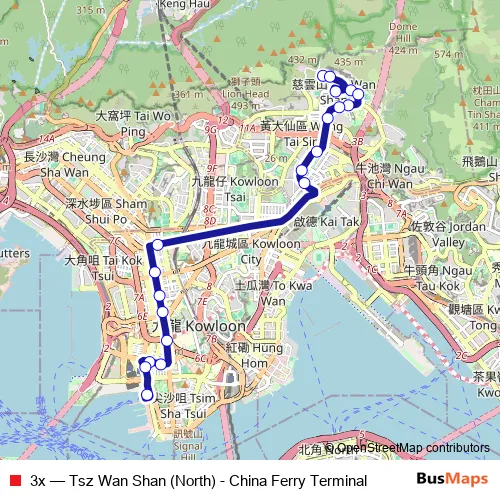 The first stop of the 3x bus route is Tsz Wan Shan Road, Near Oi Cheung House, Tsz Oi Court Stage I & Ii and the last stop is China Hong Kong City, Canton Road. 3x (Tsz Wan Shan (North) - China Ferry Terminal) is operational during everyday.