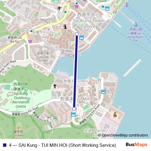 The first stop of the 4 bus route is Hong KIN Road, Near Ming Shun Village 201 and the last stop is YI Chun Street, Near SAI Kung Market. 4 (SAI Kung - TUI MIN HOI (Short Working Service)) is operational during everyday.