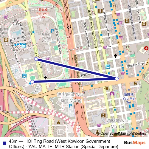 The first stop of the 43m bus route is HOI Ting Road, Outside YAU MA TEI Catholic Primary School (HOI Wang Road) and the last stop is HOI Wang Road, Outside Block 3 Charming Garden. 43m (HOI Ting Road (West Kowloon Government Offices) - YAU MA TEI MTR Station (Special Departure)) is operational during on weekdays.