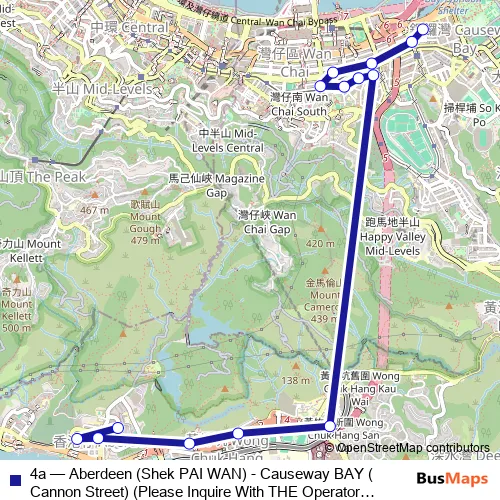 Services on the 4a - Aberdeen (Shek PAI WAN) - Causeway BAY (Cannon Street) (Please Inquire With THE Operator About THE Payment Arrangement OF THE TWO-WAY Fare ON This Route.) bus stop at 18:50 on Monday, Tuesday, Wednesday, Thursday, Friday, Saturday, Sunday.