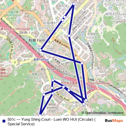 The first stop of the 501c bus route is Yung Shing Court and the last stop is Yung Shing Court. 501c (Yung Shing Court - Luen WO HUI (Circular) (Special Service)) is operational during everyday.