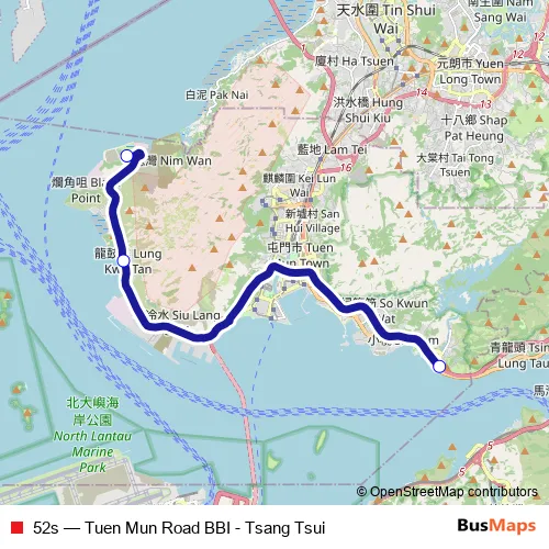 The first stop of the 52s bus route is Tuen Mun Road BBI (C1) and the last stop is Tsang Tsui. 52s (Tuen Mun Road BBI - Tsang Tsui) is operational during everyday.
