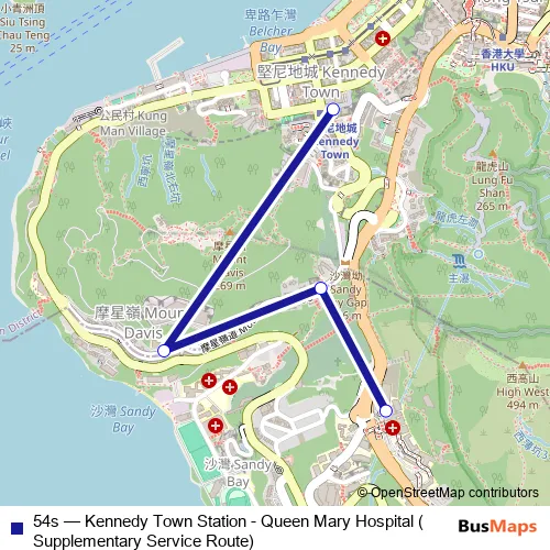 The first stop of the 54s bus route is Kennedy Town Station and the last stop is Queen Mary Hospital. 54s (Kennedy Town Station - Queen Mary Hospital (Supplementary Service Route)) is operational during on weekdays.