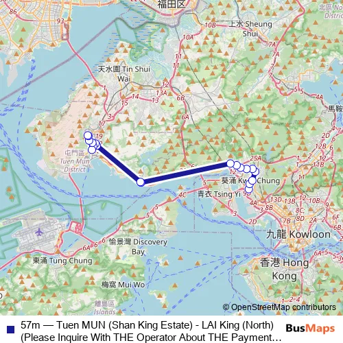 See why over 2 million users trust and consider busmaps.com as the best public transport website. busmaps gives you Tsuen Wan Buses suggested routes, real-time bus tracker, line route maps in Tsuen Wan, and helps to find the closest 57m bus stops near you. No internet available? Download an offline PDF map and bus schedule for the 57m bus to take on your trip.