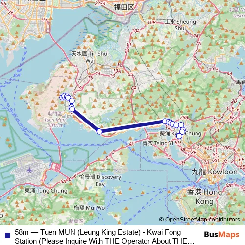 See why over 2 million users trust and consider busmaps.com as the best public transport website. busmaps gives you Tuen Mun Buses suggested routes, real-time bus tracker, line route maps in Tuen Mun, and helps to find the closest 58m bus stops near you. No internet available? Download an offline PDF map and bus schedule for the 58m bus to take on your trip.