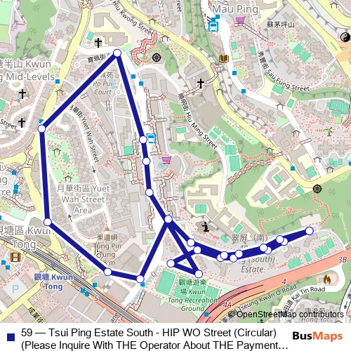 The first stop of the 59 bus route is Tsui Ping (South) Estate, Outside Tsui Chung House and the last stop is Tsui Ping (South) Estate, Outside Tsui Chung House. 59 (Tsui Ping Estate South - HIP WO Street (Circular) (Please Inquire With THE Operator About THE Payment Arrangement OF THE TWO-WAY Fare ON This Route.)) is operational during everyday.