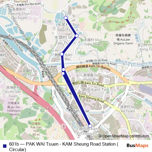The first stop of the 601b bus route is KAM TIN (PAK WAI Tsuen) Minibus Terminus and the last stop is KAM TIN (PAK WAI Tsuen) Minibus Terminus. 601b (PAK WAI Tsuen - KAM Sheung Road Station (Circular)) is operational during everyday.
