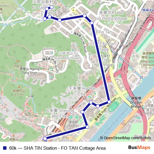 The first stop of the 60k bus route is Shatin Station|Sha TIN Station and the last stop is FO TAN Cottage Area. 60k (SHA TIN Station - FO TAN Cottage Area) is operational during everyday.