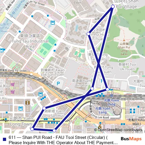 The first stop of the 611 bus route is Shan PUI Road, Near Shan PUI Hung TIN Tsuen and the last stop is Shan PUI Road, Near Shan PUI Hung TIN Tsuen. 611 (Shan PUI Road - FAU Tsoi Street (Circular) (Please Inquire With THE Operator About THE Payment Arrangement OF THE TWO-WAY Fare ON This Route.)) is operational during everyday.
