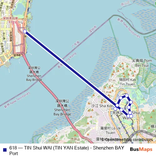 The first stop of the 618 bus route is Shenzhen BAY Port and the last stop is TIN YAN Shopping Centre. 618 (TIN Shui WAI (TIN YAN Estate) - Shenzhen BAY Port) is operational during everyday.