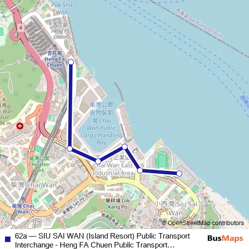 The first stop of the 62a bus route is SIU SAI WAN (Island Resort) Public Transport Interchange and the last stop is Heng FA Chuen Public Transport Interchange|Heng FA Chuen Public Transport Interchang. 62a (SIU SAI WAN (Island Resort) Public Transport Interchange - Heng FA Chuen Public Transport Interchange) is operational during everyday.