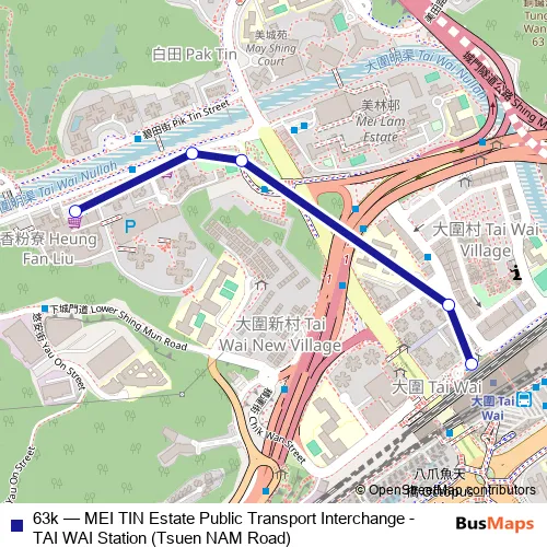 The first stop of the 63k bus route is Tsuen NAM Road, Near TAI WAI Station|Tsuen NAM Road, Near TAI WAI Station and the last stop is MEI TIN Shopping Centre, MEI TIN Estate. 63k (MEI TIN Estate Public Transport Interchange - TAI WAI Station (Tsuen NAM Road)) is operational during everyday.