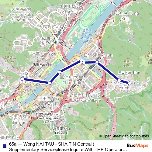 See why over 2 million users trust and consider busmaps.com as the best public transport website. busmaps gives you Sha Tin Buses suggested routes, real-time bus tracker, line route maps in Sha Tin, and helps to find the closest 65a bus stops near you. No internet available? Download an offline PDF map and bus schedule for the 65a bus to take on your trip.