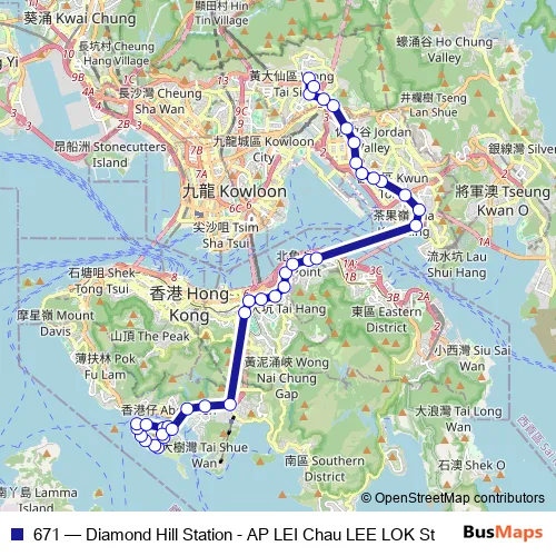 See why over 2 million users trust and consider busmaps.com as the best public transport website. busmaps gives you Hong Kong Buses suggested routes, real-time bus tracker, line route maps in Hong Kong, and helps to find the closest 671 bus stops near you. No internet available? Download an offline PDF map and bus schedule for the 671 bus to take on your trip.